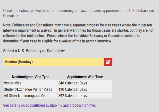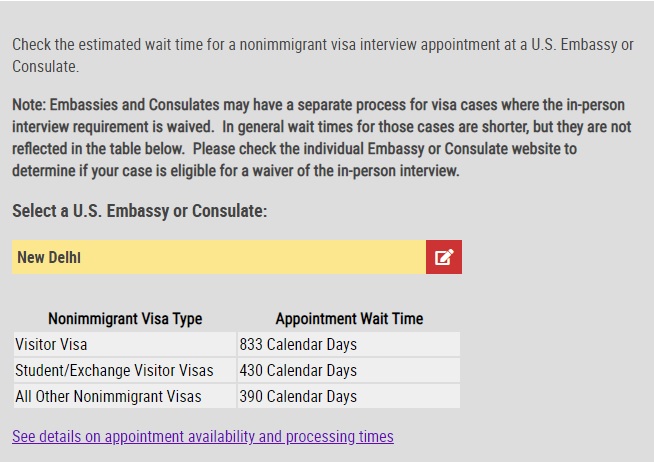 There's an appointment wait time of 833 days for applications from Delhi and 848 days from Mumbai for visitor visas, shows the US State Department's website.