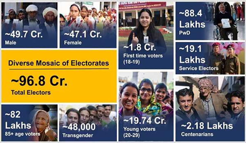 According to the Election Commission of India (ECI), the total electorate in the country as per finally published Electoral rolls regarding 01.01.2024 as the qualifying date is 968.8 million (96.88 crores) compared to 896 million (89.6 crores) in 2019. This marks an increase of more than 72.8 million (7.28 crore) electors.