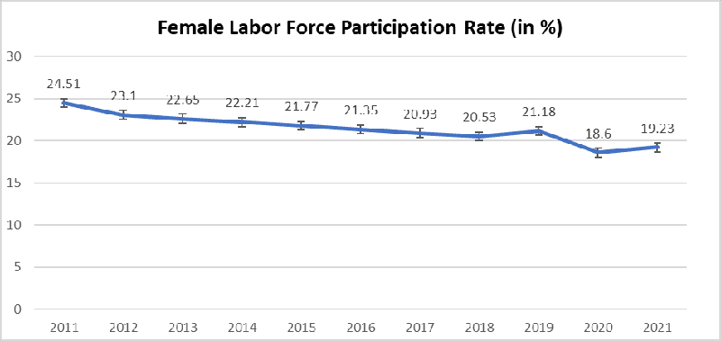 Women account for 48 percent of the population in India, but they only contribute about 18 percent to the GDP, while in China they make up 41 percent. According to the World Bank Report, women in India have one of the world's lowest female labor force participation. Women still aren't actively contributing to the formal economy, despite the fact that the economy has improved, educational attainment has increased, and birth rates have also dropped.