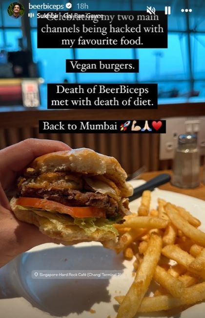 Posting a picture of a meal, he wrote, "Celebrating my two main channels being hacked with my favourite food. Vegan burgers. Death of BeerBiceps met with Death of diet."
