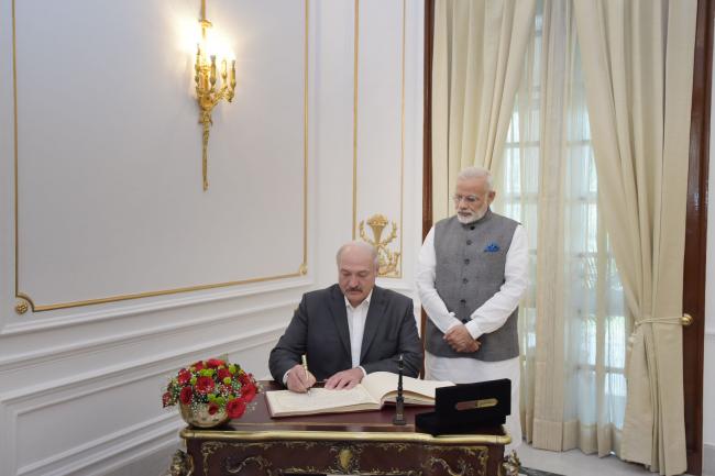 The President of the Republic of Belarus, MrAlexanderLukashenko signing the visitors’ book, at Hyderabad House, in New Delhi on September 12, 2017. The Prime Minister, Narendra Modi is also seen.
