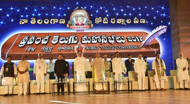 The Vice President, M. Venkaiah Naidu at the World Telugu Conference, in Hyderabad on December 15, 2017. The Governor of Andhra Pradesh and Telangana, E.S.L. Narasimhan, the Chief Minister of Telangana, Chandrashekar Rao and other dignitaries are also seen.