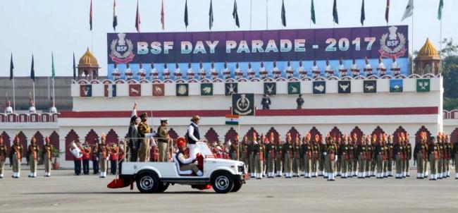 The Vice President, M. Venkaiah Naidu reviewing the parade, on the occasion of 52nd Raising Day Ceremony, in New Delhi on December 01, 2017. The Director General, BSF, K.K. Sharma is also seen.
