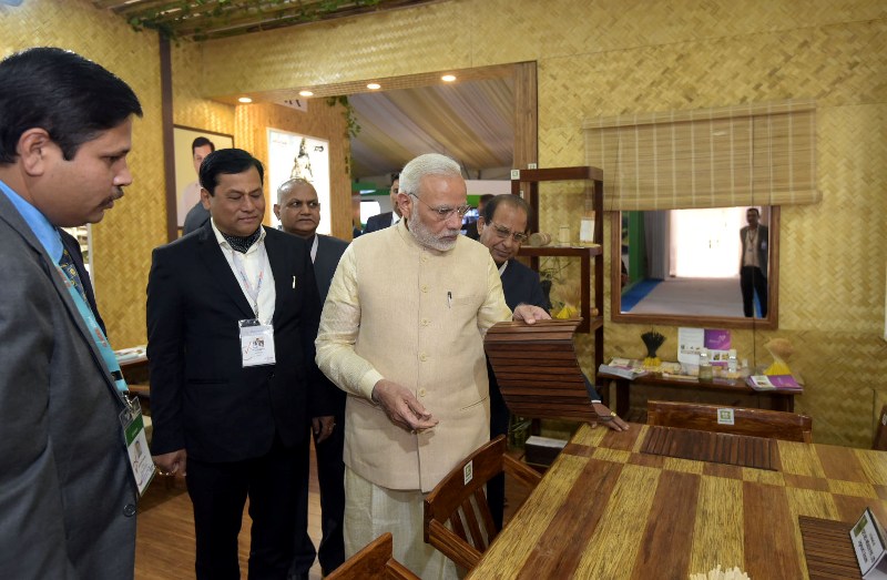 The Prime Minister, Narendra Modi at the exhibition Advantage Assam, in Guwahati, Assam on February 03, 2018. The Chief Minister of Assam, Sarbananda Sonowal is also seen.