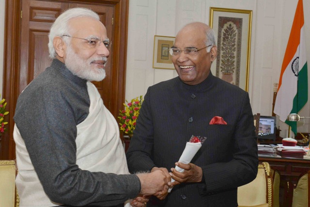 The Prime Minister, Narendra Modi greeting the President, Ram Nath Kovind on the occasion of New Year, at Rashtrapati Bhavan, in New Delhi on January 01, 2018.