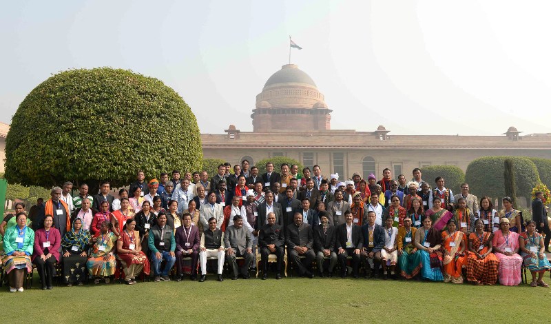 The President, Ram Nath Kovind with the artistes who had participated in the 69th Republic Day Parade, at Rashtrapati Bhavan, in New Delhi on January 27, 2018. The Union Minister for Tribal Affairs, Jual Oram and the Ministers of State for Tribal Affairs, Sudarshan Bhagat and Jaswantsinh Sumanbhai Bhabhor are also seen.