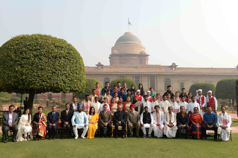 The President, Ram Nath Kovind with the artistes who had participated in the 69th Republic Day Parade, at Rashtrapati Bhavan, in New Delhi on January 27, 2018.