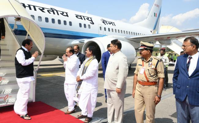 The Vice President, M. Venkaiah Naidu being received by the Deputy Chief Minister of Telangana, Mohammad Mahmood Ali, on his arrival, in Hyderabad on November 18, 2017.