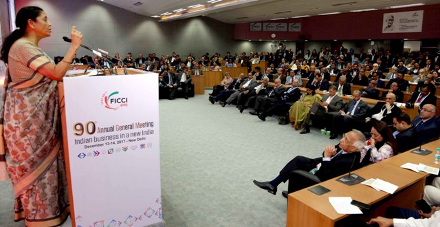 The Union Minister for Defence, Nirmala Sitharaman addressing at the 90th Annual General Meeting of FICCI, in New Delhi on December 14, 2017.