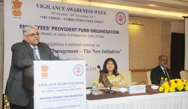The Vigilance Commissioner, CVC, T. M. Bhasin addressing at the National Seminar on Fraud Risk Management-The New Initiatives, organised by the Employees’ Provident Fund Organisation (EPFO), in New Delhi on November 03, 2017.