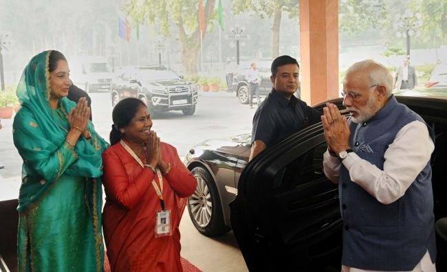 The Prime Minister, Narendra Modi being welcomed by the Union Minister for Food Processing Industries, Harsimrat Kaur Badal and the Minister of State for Food Processing Industries, Sadhvi Niranjan Jyoti, on his arrival at the inauguration ceremony of the World Food India 2017, at Vigyan Bhawan, in New Delhi on November 03, 2017.