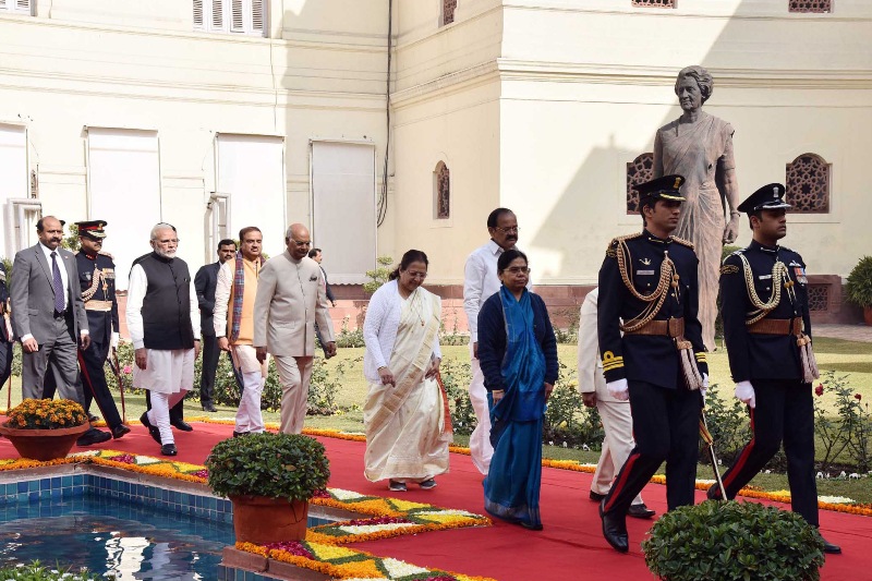 The President, Ram Nath Kovind, the Vice President, M. Venkaiah Naidu, the Prime Minister, Narendra Modi, the Speaker, Lok Sabha, Sumitra Mahajan and the Union Minister for Chemicals & Fertilizers and Parliamentary Affairs, Ananth Kumar arrives at Parliament on beginning of Budget Session of Parliament, in New Delhi on January 29, 2018.