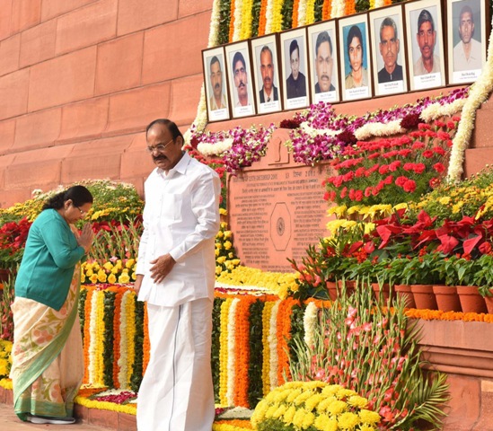 The Speaker, Lok Sabha, Sumitra Mahajan paying homage to the martyrs of the Parliament attack, at Parliament building, in New Delhi on December 13, 2017.