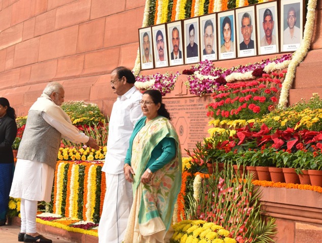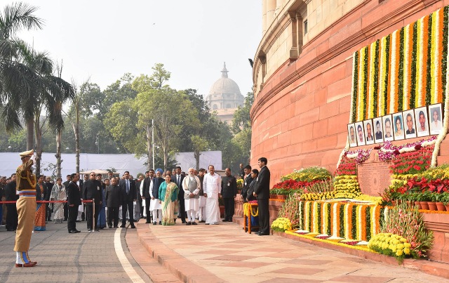 The Prime Minister, Narendra Modi paying floral tributes to the martyrs of the 2001 Parliament attack, at Parliament building, in New Delhi on December 13, 2017.