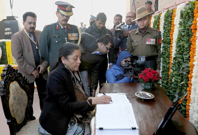 The Union Minister for Defence, Nirmala Sitharaman signing the visitors’ book, after paying homage to the Martyrs, at Amar Jawan Jyoti, India Gate, on the Occasion of Vijay Diwas, in New Delhi on December 16, 2017.