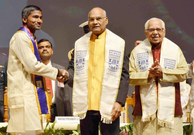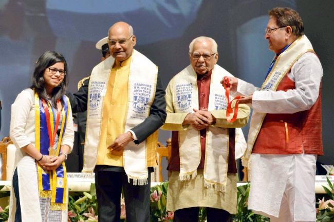 The President, Ram Nath Kovind presenting the Gold Medal to a student, at the 7th Convocation of Babasaheb Ambedkar University, at Lucknow, in Uttar Pradesh on December 15, 2017. The Governor of Uttar Pradesh, Ram Naik is also seen.