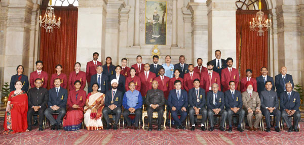 The President,Ram Nath Kovind with the sports and adventure awardees, in a glittering ceremony, at Rashtrapati Bhavan, in New Delhi on August 29, 2017. The Minister of State for Youth Affairs and Sports (I/C), Water Resources, River Development and Ganga Rejuvenation,Vijay Goel and the Secretary, (Sports),Injeti Srinivas are also seen.