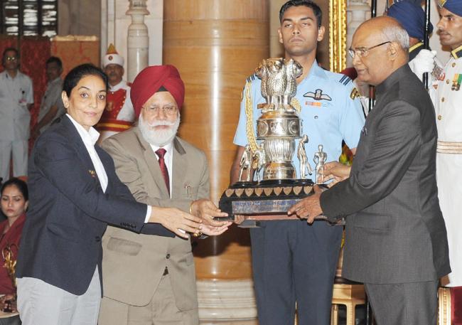 The President,Ram Nath Kovind presenting the Tenzing Norgay National Adventure Award, 2017 toPremlata Agrawal for Land Adventure, in a glittering ceremony, at Rashtrapati Bhavan, in New Delhi on August 29, 2017.
