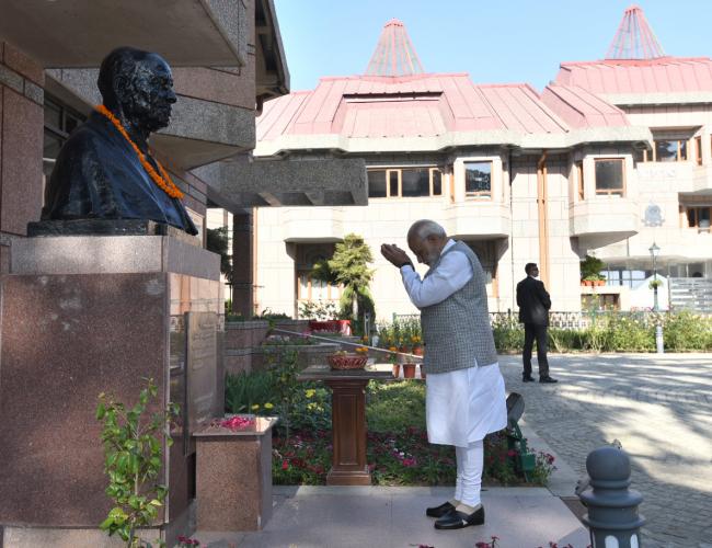 The Prime Minister, Narendra Modi offering the floral tributes on the statue of the former Prime Minister, Lal Bahadur Shastri, at the Lal Bahadur Shastri National Academy of Administration (LBSNAA), in Mussoorie, Uttarakhand on October 26, 2017.