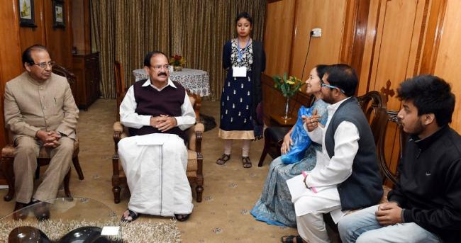 The Vice President, M. Venkaiah Naidu meeting the members of Assam Association of the Deaf, in Guwahati, Assam on December 02, 2017. The Governor of Assam, Jagdish Mukhi is also seen.