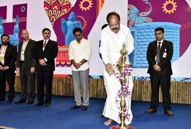 The Vice President, M. Venkaiah Naidu lighting the lamp to inaugurate the Entrepreneurs’ Organisation Global University Conference 2017, in Hyderabad on October 25, 2017. The Minister for IT, Municipal Administration & Urban Development, Industries & Commerce, Public Enterprises, Sugar, Mines & Geology, NRI Affairs, Telangana, K.T. Rama Rao is also seen.