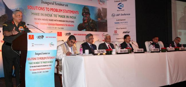 The Chief of Army Staff, General Bipin Rawat addressing the gathering, at a seminar on Solutions to Problem Statements with the theme ‘Indigenous Technological Empowerment of the Indian Army’ in New Delhi on October 25, 2017. The Minister of State for Defence, Dr. Subhash Ramrao Bhamre and other dignitaries are also seen.