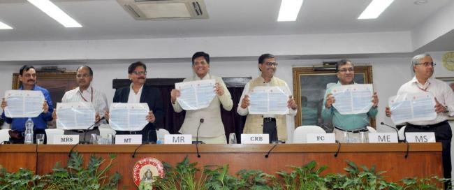 The Union Minister for Railways and Coal, Piyush Goyal releasing a Charter for Railway employees, at a press conference on recent decisions taken in Railways, in New Delhi on October 25, 2017. The Chairman, Railway Board, Ashwani Lohani and other dignitaries are also seen.