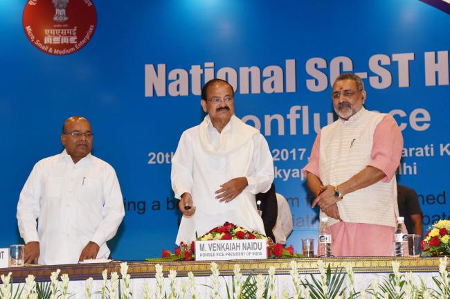 The Vice President,MVenkaiah Naidu addressing the National SC-ST Hub Confluence, organised by the Ministry of Micro, Small & Medium Enterprises, in New Delhi on September 20,2017