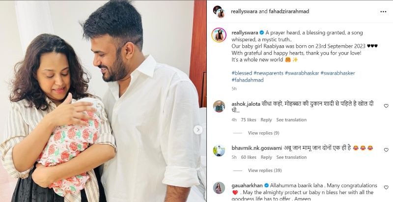 "A prayer heard, a blessing granted, a song whispered a mystic truth. Our baby girl Raabiyaa was born on 23rd September 2023. With grateful and happy hearts, thank you for your love! It's a whole new world," the caption read.