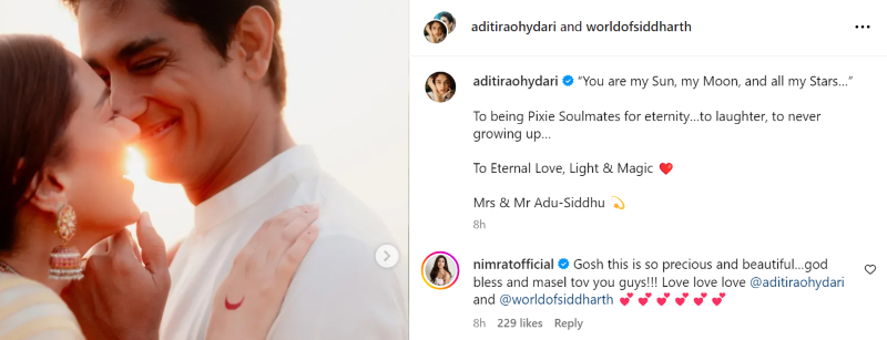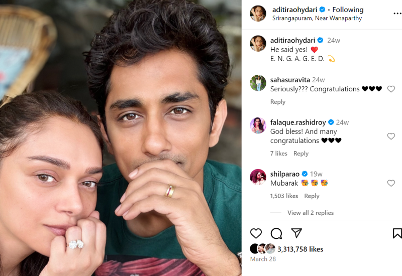 In March 2024, Aditi announced her engagement with Siddharth in an Instagram post, surprising her fans and followers. The two actors were seen flashing their engagement rings.