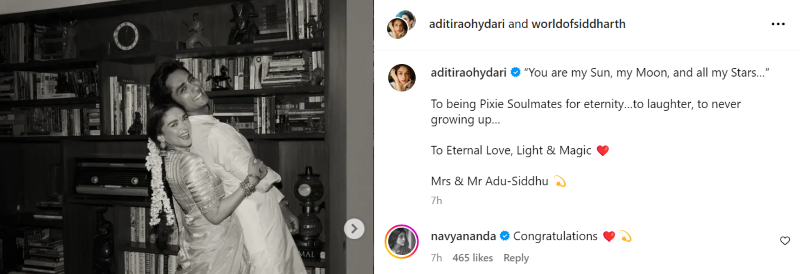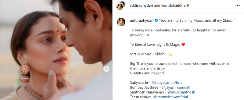 The 'Heeramandi' actress wrote in the caption, "'You are my Sun, my Moon, and all my Stars…' To being Pixie Soulmates for eternity…to laughter, to never growing up… To Eternal Love, Light & Magic. Mrs & Mr Adu-Siddhu."