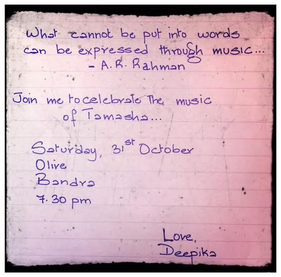 Mumbai, Nov 5 (IBNS) Deepika Padukone sent unique invites to guests inviting them for Tamasha's Music celebrations held at a Suburban Restaurant recently.