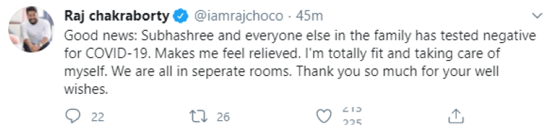 He tweeted, "Good news: Subhashree and everyone else in the family has tested negative for COVID-19. Makes me feel relieved. I'm totally fit and taking care of myself. We are all in seperate rooms. Thank you so much for your well wishes."
