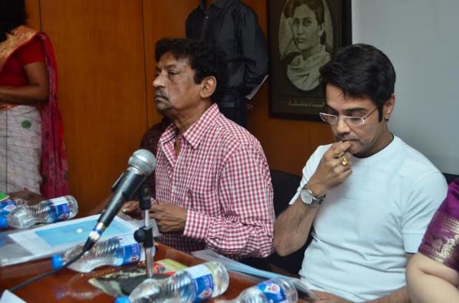 Image: Goutam Ghosh with lead actor Prosenjit addressing students during Sankhochil promotion