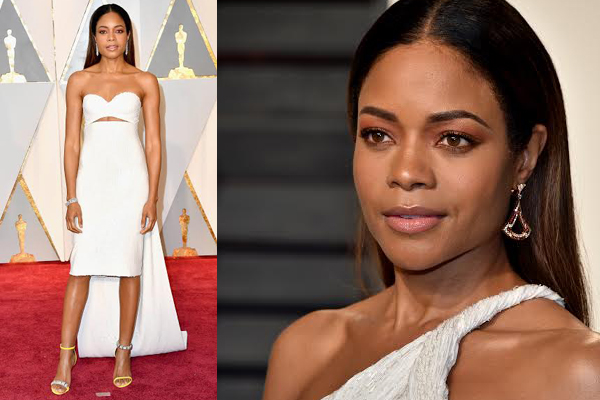 Naomie Harris, who is nominated for the Academy Award for Actress in a Supporting Role for her role in the film, wore a Calvin Klein By Appointment white strapless sequin dress. Harris also wore Fall 2017 CALVIN KLEIN sunflower suede sandals with asymmetrical crystal straps.