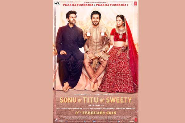 "From the director of #PyaarKaPunchnama series... First look poster of Luv Ranjan's #SonuKeTituKiSweety... Stars Kartik Aaryan, Nushrat Bharucha and Sunny Singh... Produced by TSeries and Luv Films... Release on 9 Feb 2018 to coincide with Valentine’s Day [14 Feb 2018]… " the tweet reads.