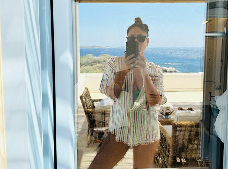 In the image, Kareena could be seen sporting a striped shirt over swimwear.