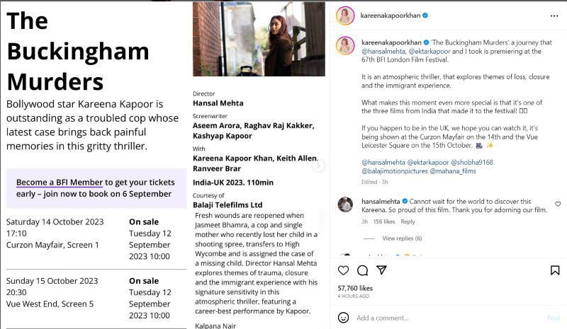 "The Buckingham Murders' a journey that @hansalmehta, @ektarkapoor and I took is premiering at the 67th BFI London Film Festival. It is an atmospheric thriller, that explores themes of loss, closure and the immigrant experience. What makes this moment even more special is that it's one of the three films from India that made it to the festival!" her caption read.