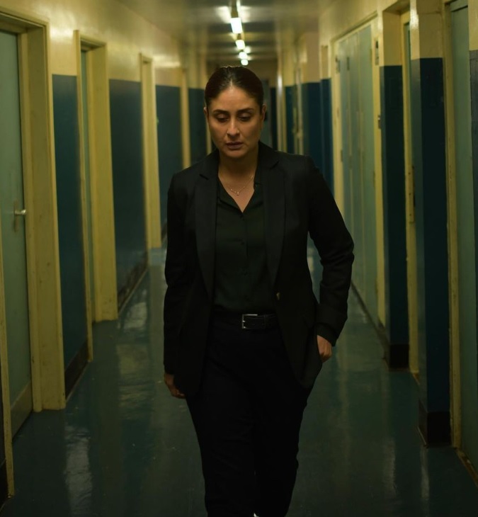 In both the images Kareena looks intense. In one frame, Kareena, looking downwards, is seen walking an empty corridor. In the other frame, Kareena can be seen looking outside.