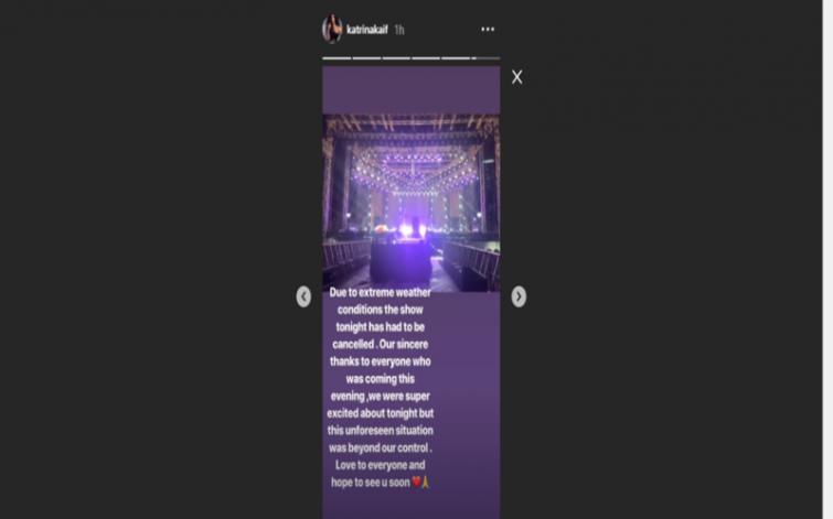 Though the 35-year old actress did not mention the show, Kaif said in an Instagram story, "Due to extreme weather conditions the show tonight has had to be cancelled. Our sincere thanks to everyone who was coming this evening, we were super excited about tonight but this unforeseen situation was beyond our control. Love to everyone and hope to see u soon."