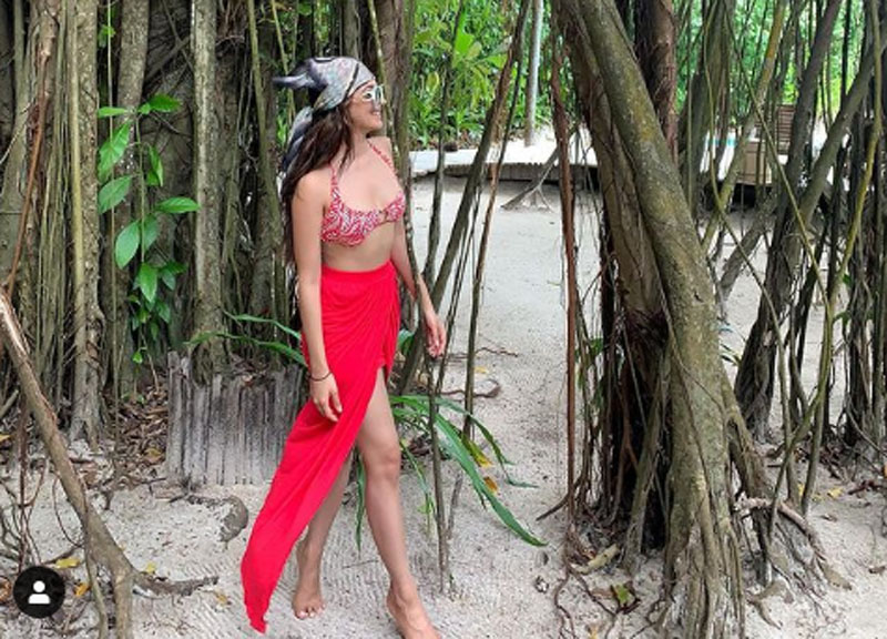 In the latest image, the actress could be seen sporting a red beach dress and posing in front of tropical trees.