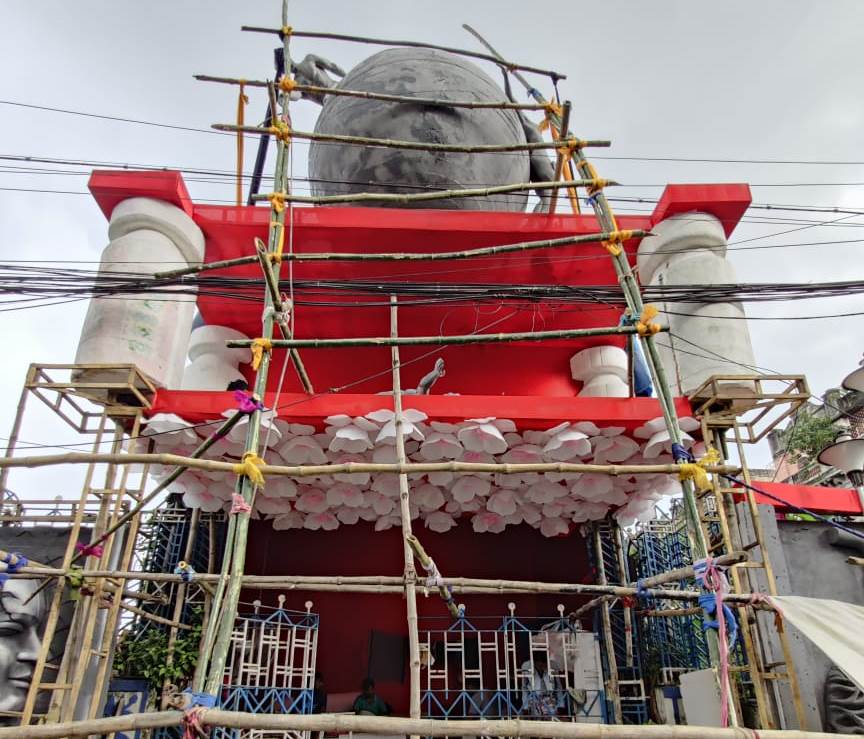 The organisation, known for presenting elaborate idols and decoration, has taken a modest stance this year with artist Kush Bera from Midnapore casting the idol on a modest ‘ekchala’.