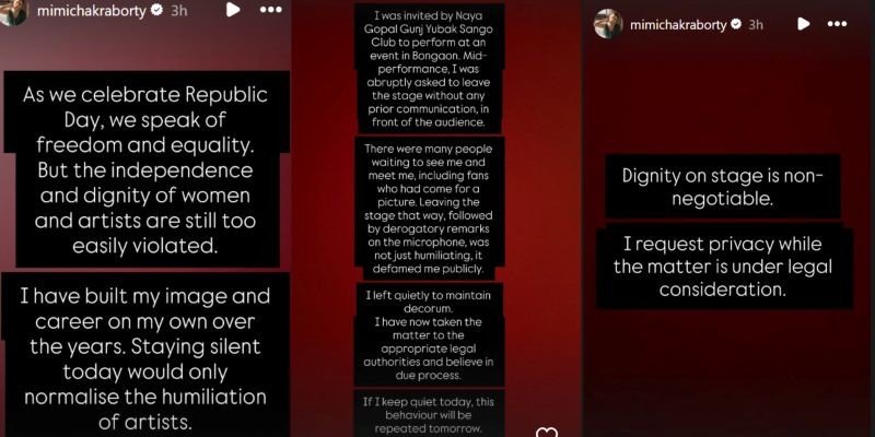 In an Instagram post, Chakraborty claimed she was abruptly asked to leave the stage without prior notice.