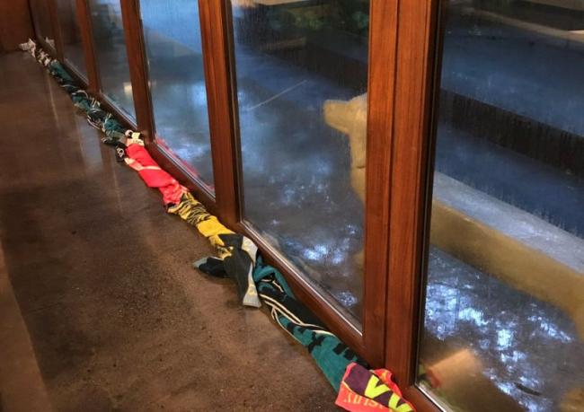 In the picture, she is seen putting his husband's towels for stopping rain water entering their house.