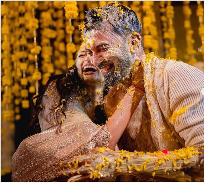 The first image is a happy picture of Athiya and cricketer KL Rahul, their faces and arms are covered with Haldi paste.