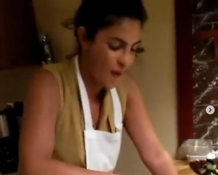In the video, India's 'Desi Girl' could be seen stirring pasta sauce in a pan on the stove with a glass of wine in one hand.