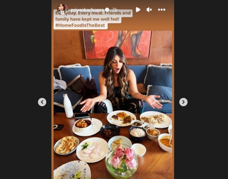 On Friday, Priyanka Chopra shared a picture of herself gorging on several Indian delicacies on her Instagram stories.