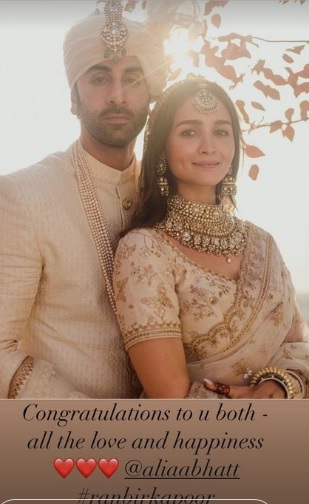 After the wedding, Alia shared pictures from the ceremony on her Instagram. In the comments thread, Katrina Kaif wrote: "Congratulations to both of u. All the love and happiness."