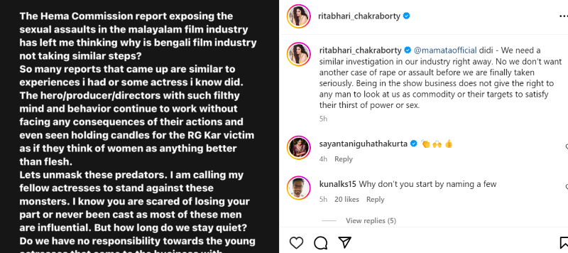 "The hero/producer/directors with such filthy mind and behaviour continue to work without facing consequences of their actions and (are) even seen holding candles for the RG Kar victim as if they think of women as anything better than flesh," Ritabhari writes.