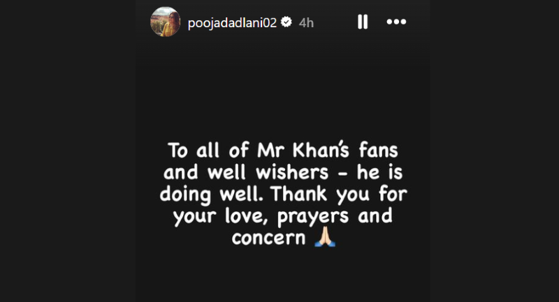 In an Instagram story, Pooja wrote, "To all of Mr. Khan's fans and well wishers- he is doing well. Thank you for your love, prayers and concern."